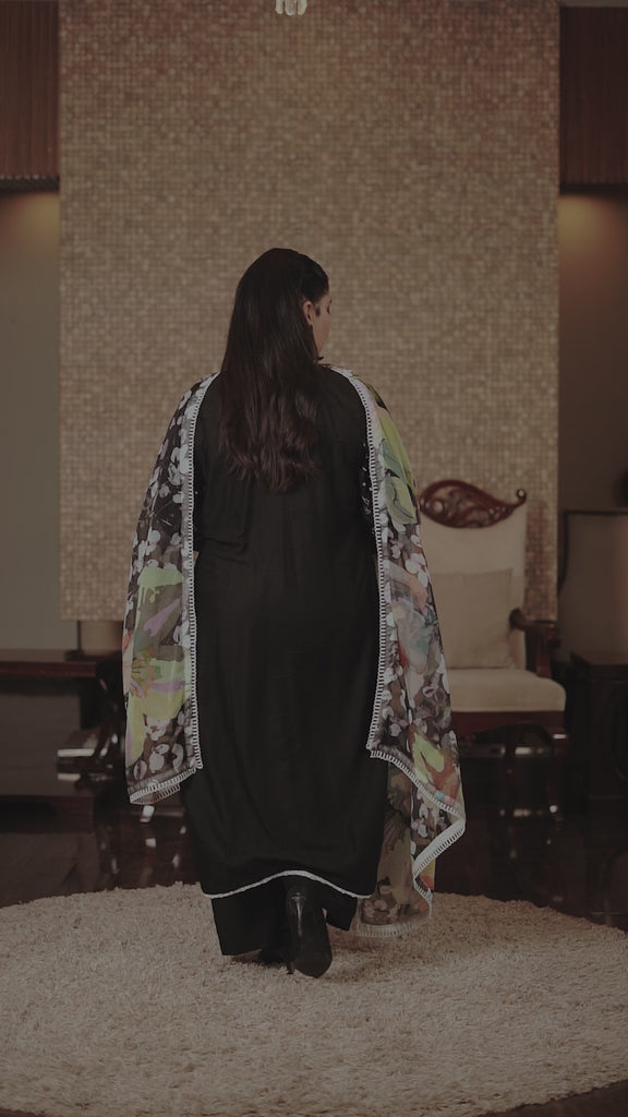 Wrap up in the noir perfection of this readymade luxury black dress offering vivid styling and subtle elegance. The unique and classy threadwork showcases luxe in every stitch. Moreover, cutwork floral design on the sleeves and hemline ensures to make your look is bold and aesthetically pleasing. Matching simple trousers and a chiffon printed dupatta infuses a wow factor. Linen fabric gives you the effortless comfort and styling you deserve to be confident.