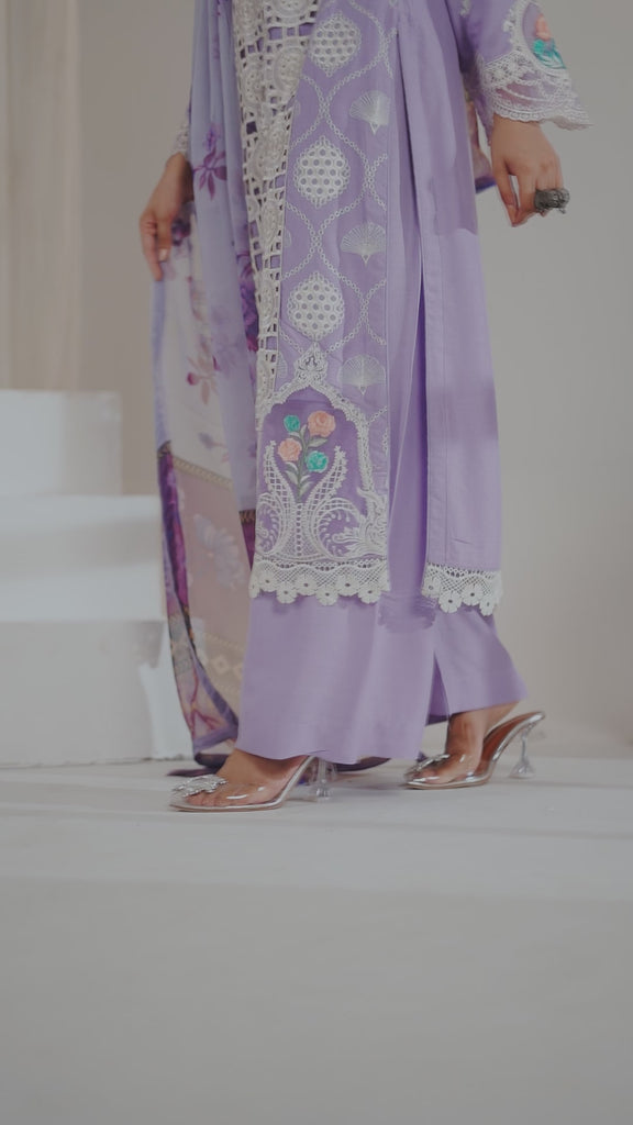Set your style on fire in the radiance of this opulent, readymade dress featuring vibrant lavender color. The linen fabric of this attire is ideal for any semi-formal events, offering comfort and luxury. Long shirt featuring lavish, intricate embroidered and tissue patches offers timeless elegance. The eyelet design on the shirt’s front and tissue patches on the hemline and sleeves make this dress captivating with serene grace. The chiffon printed dupatta featuring tassels and minimal bellbottoms epitomizes grace and makes your style radiate effortlessly.